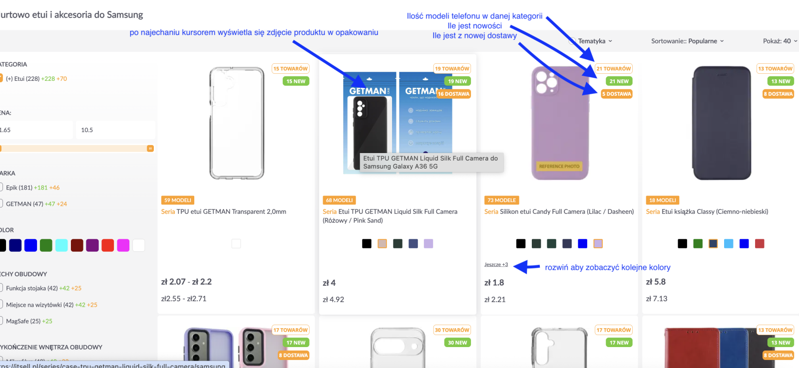 Kliknij kolorowe znaczniki pod kartą produktu lub wybierz „Jeszcze +X”, aby zobaczyć więcej wariantów. -