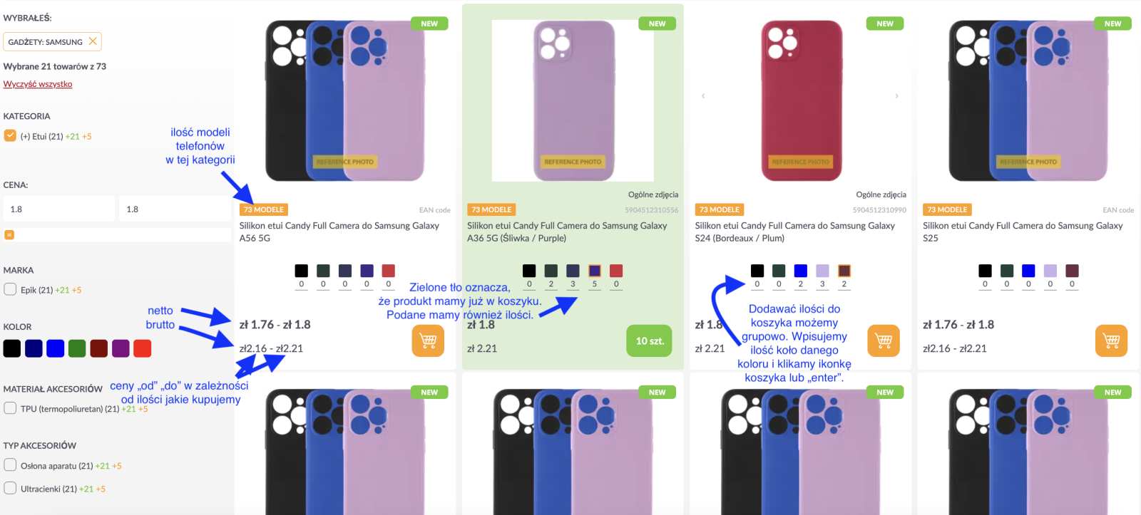 Wpisz ilość przy wybranym kolorze i kliknij ikonę koszyka lub naciśnij „Enter”. Możesz dodawać kilka wariantów jednocześnie. -