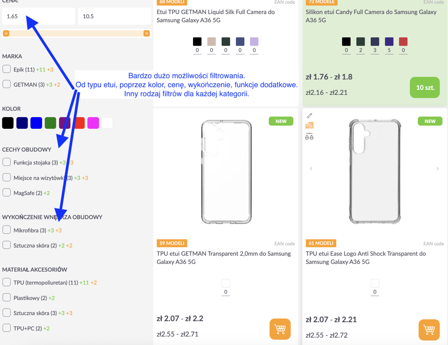 Użyj filtrów po lewej: cena, marka, kolor, materiał, typ akcesorium, funkcje (np. MagSafe, stojak). Filtry różnią się w zależności od kategorii. -
